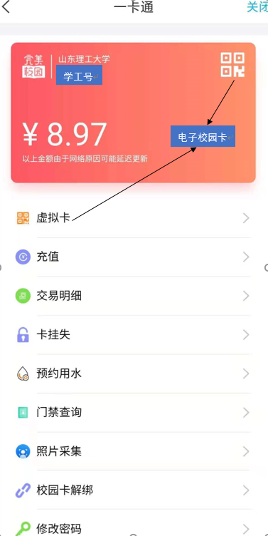 2)在终端机扫码处,使用“山东理工大学”APP →“应用”→“一卡通”,点击“虚拟卡” 或右上角二维码(电子校园卡),扫描此码即可进行消费或身份认证。